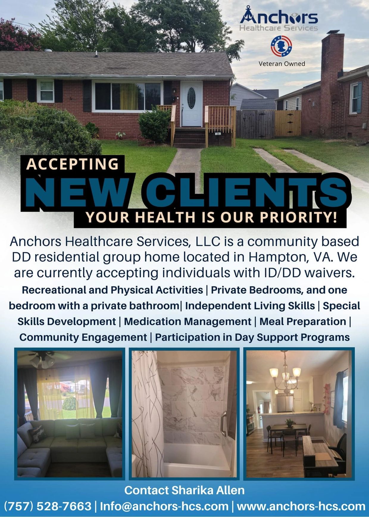 Welcome to Anchors Healthcare Services, proudly owned and operated by Sharika Allen in Hampton, VA. We specialize in providing exceptional Supported Living Services for individuals with developmental and intellectual disabilities (DD/ID). Our team is dedicated to fostering independence, enhancing quality of life, and creating a supportive, inclusive environment for our clients. Anchors Healthcare Services proudly accepts clients with DD/ID waivers, ensuring access to the personalized care and resources they need to thrive. Partner with us to anchor your loved ones in compassionate, professional care.